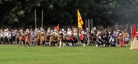 Průběh střetnutí historickou skutečnost moc nepřipomínal, neboť stavovské vojsko se do válčení pustilo se skutečnou vervou. Boj se převaloval sem i tam, poměrně brzy však bylo znát, že pravá křídla obou soupeřů převyšují své protějšky. Stavovští, postupující podél zdi obory, neúnavně dotírali na nepřítele. Na fotografii je názorně vidět obtížné ovládání píky, držené až na spodním konci – ratiště s ocelovým hrotem tvoří mocnou páku a zbraň musí třímat silní chlapi.